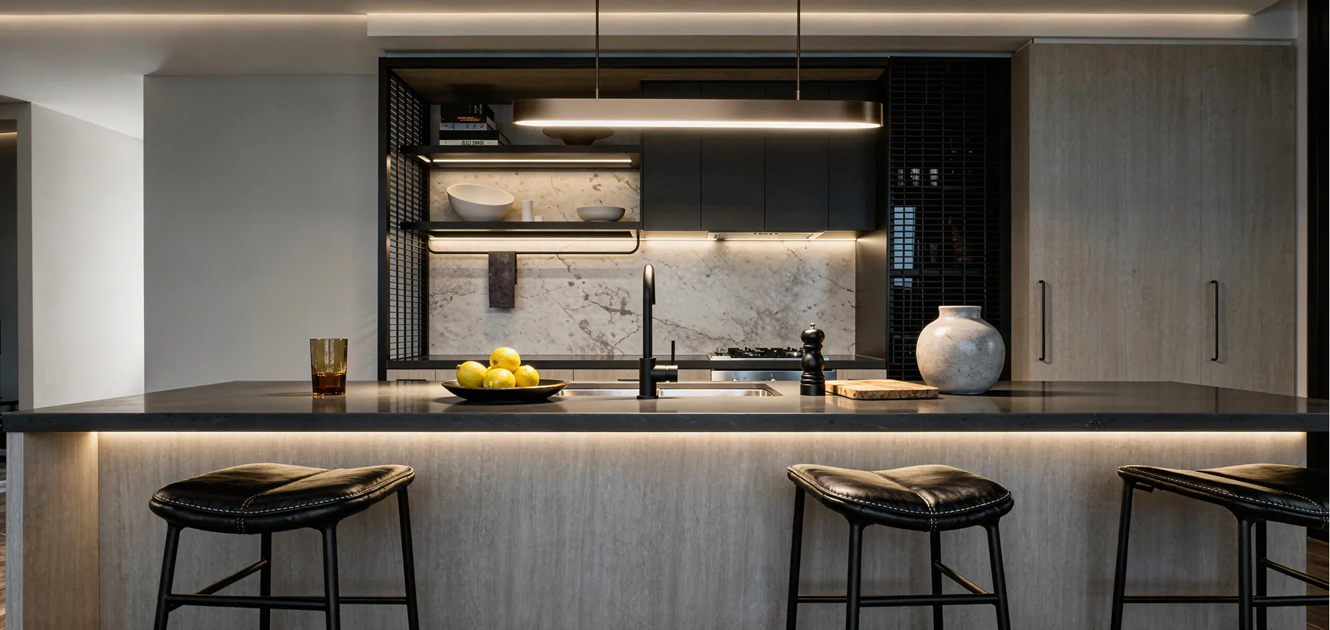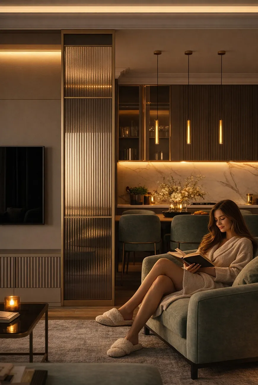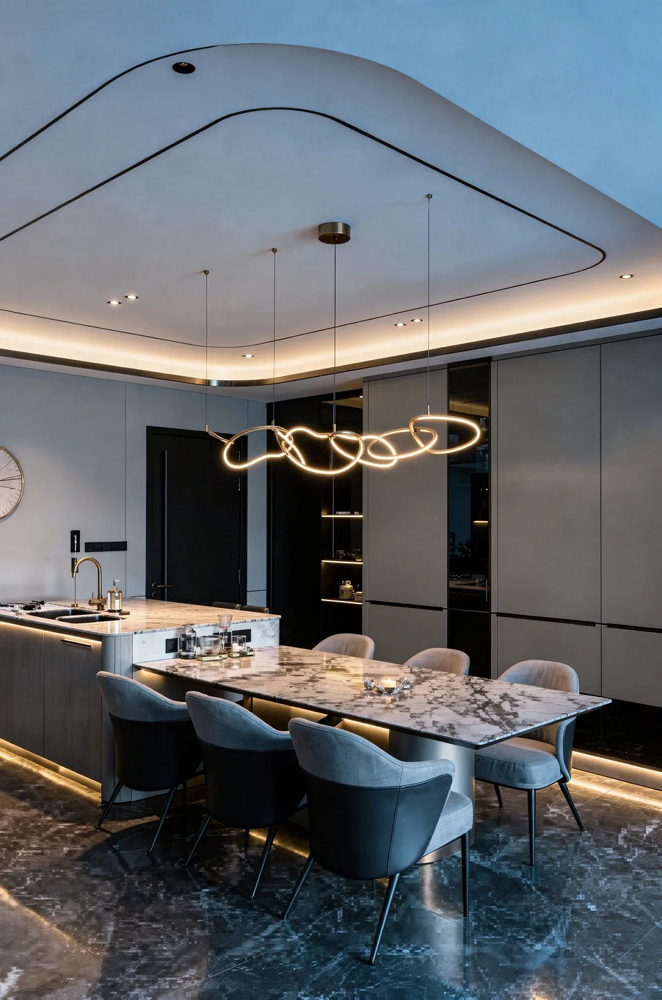 Подсветка острова и кухонного гарнитура — цифровая проекция темперамента владельца. Холодный циан включается в утренние часы, синхронизируясь с его аналитическим мышлением, а к вечеру свет трансформируется в глубокий янтарный, раскрывая скрытую страсть к экспериментам.