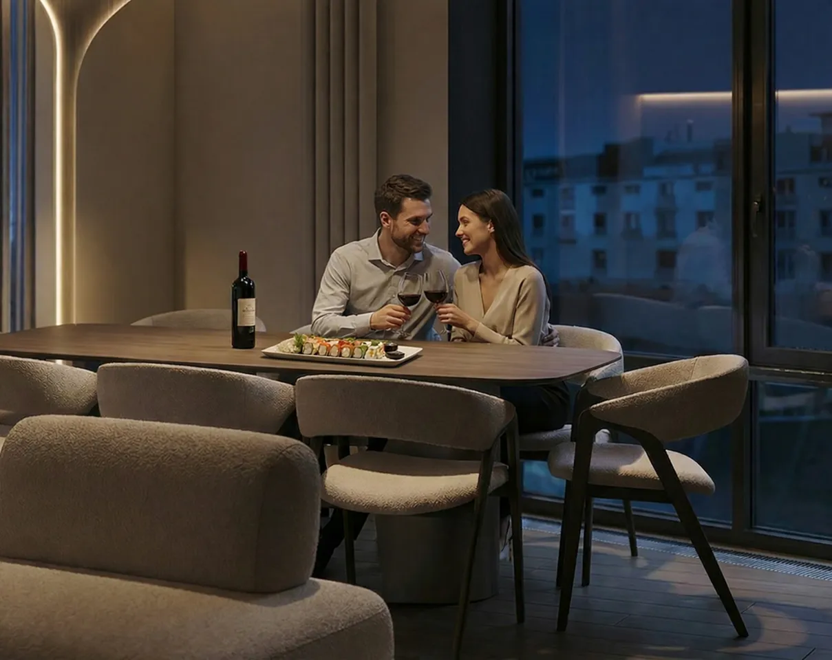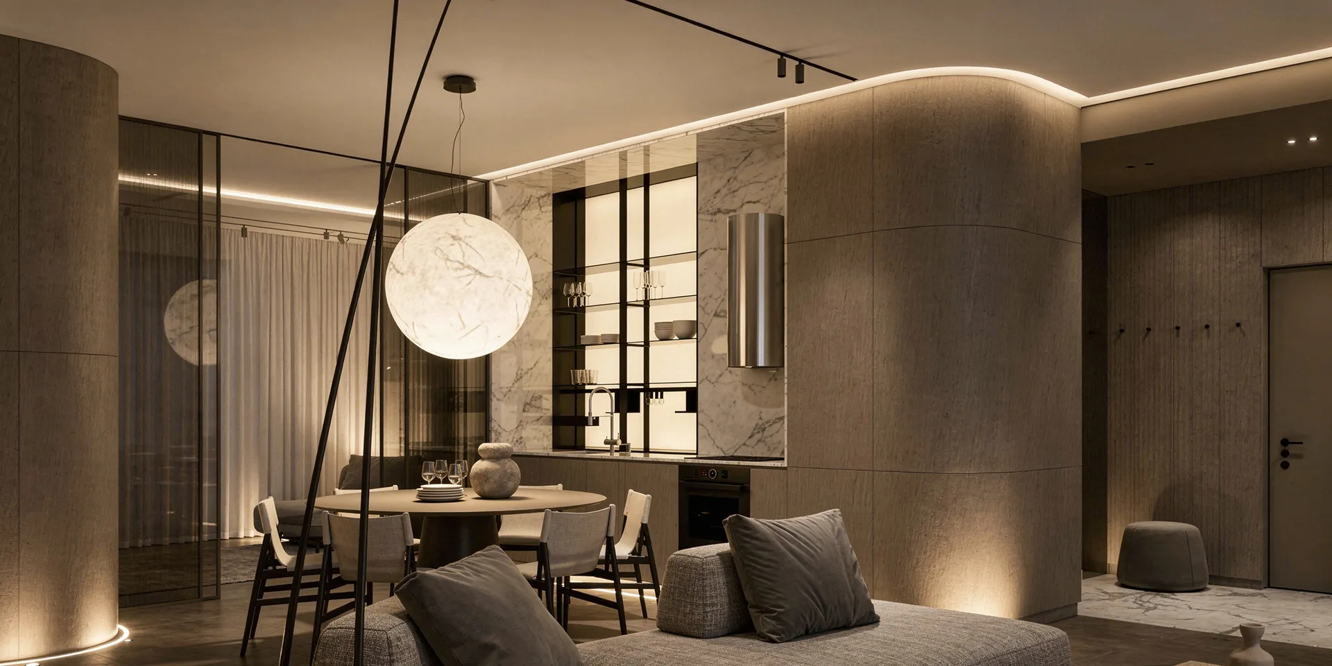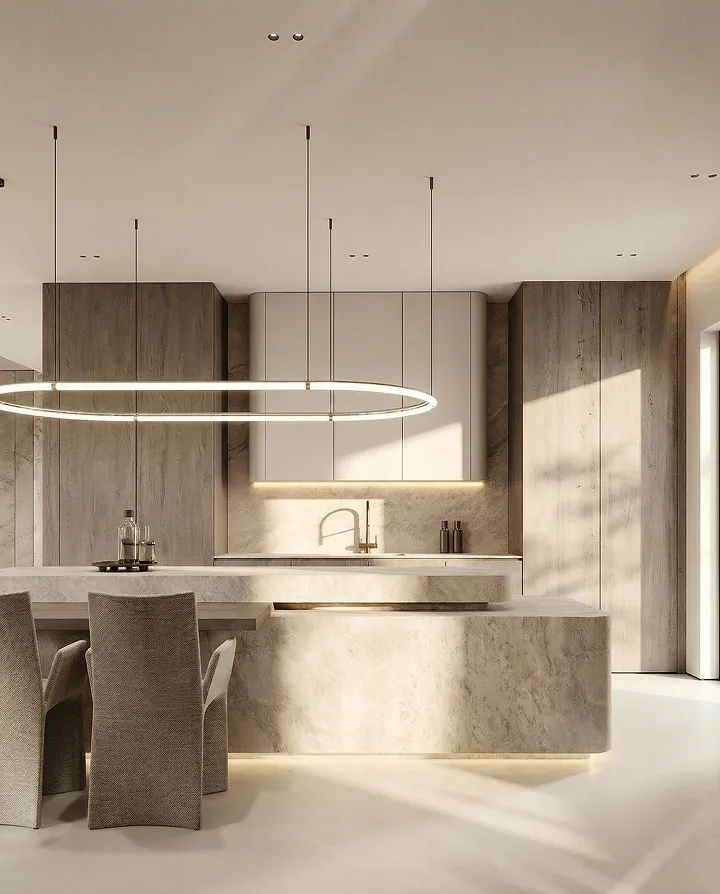 Подсветка острова и кухонного гарнитура — цифровая проекция темперамента владельца. Холодный циан включается в утренние часы, синхронизируясь с его аналитическим мышлением, а к вечеру свет трансформируется в глубокий янтарный, раскрывая скрытую страсть к экспериментам.