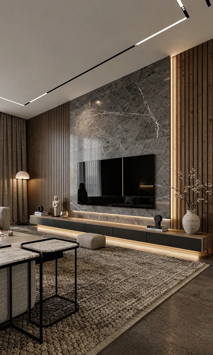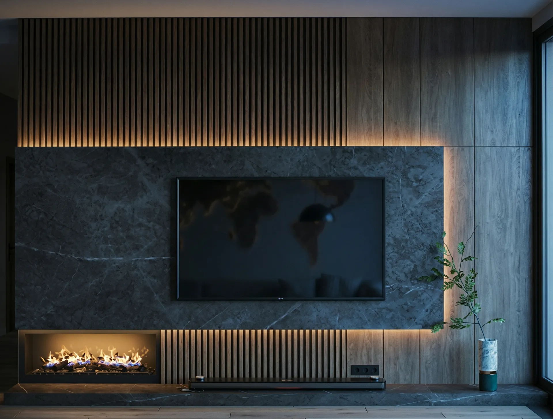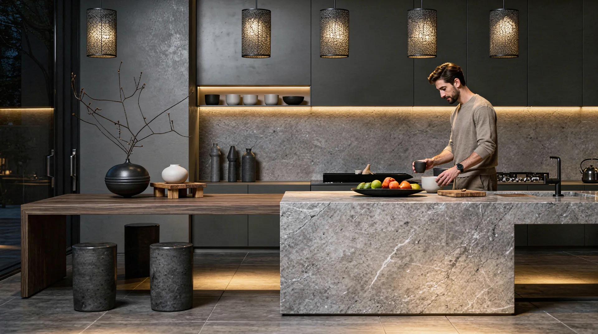 Глубокие графитовые тона в сочетании с темным деревом и камнем подчеркивают внутреннюю силу и уверенность — здесь нет места компромиссам, только выверенная точность.