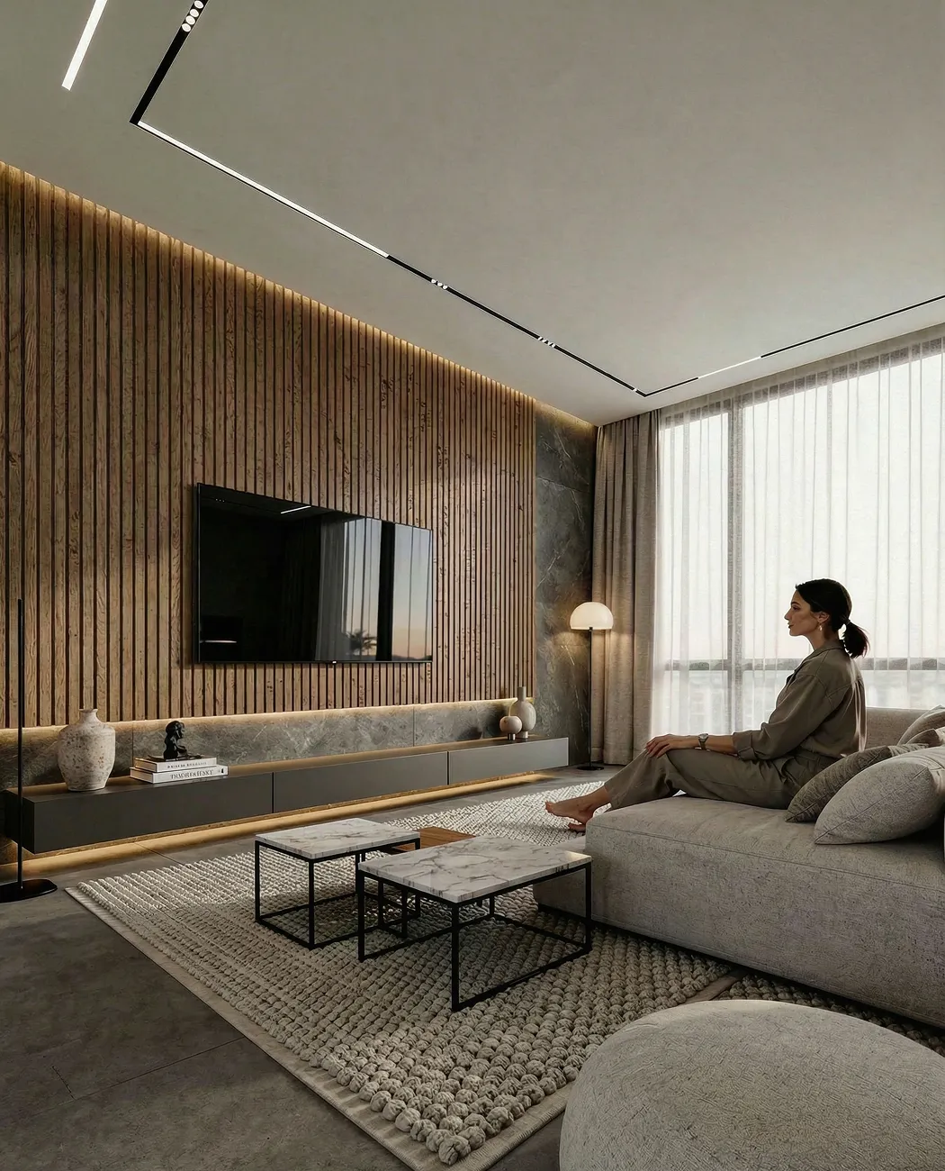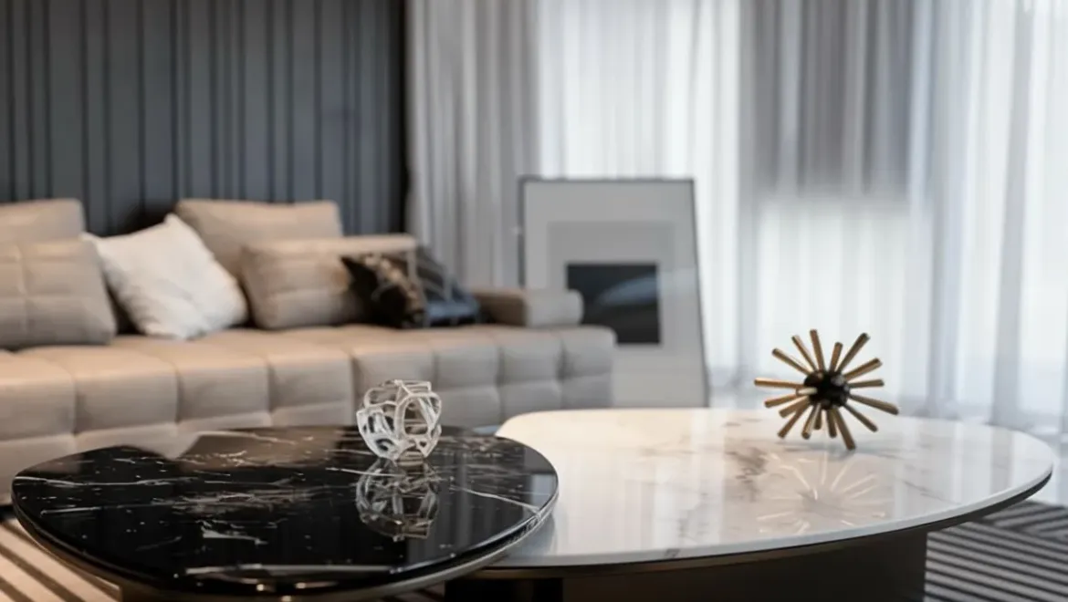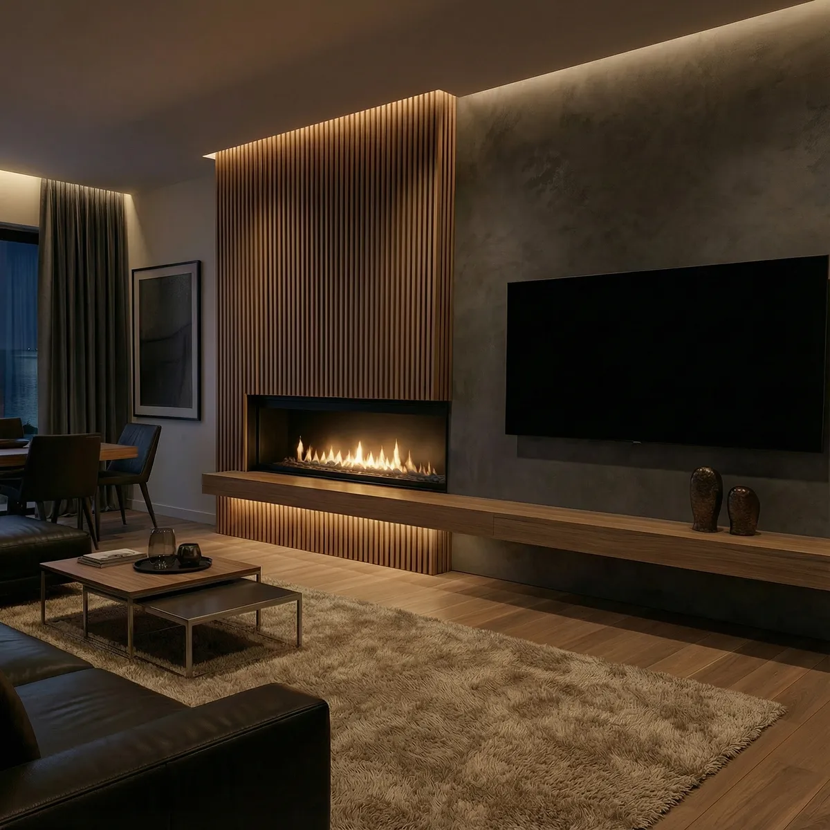 Глубокие графитовые тона в сочетании с темным деревом и камнем подчеркивают внутреннюю силу и уверенность — здесь нет места компромиссам, только выверенная точность.
